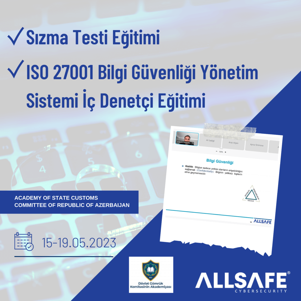 ALLSAFE Siber Güvenlik ekibimiz Gülşah BAKIRLI, Hüseyin Serkan BALKANLI, Buğra TÜRKOĞLU ve Oğuzhan KARA tarafından, 15-19.05.2023 tarihleri arasında Academy of State Customs Committee of Republic of Azerbaijan | Dövlət Gömrük Komitəsinin Akademiyası öğrencilerine yönelik “Sızma Testi ve ISO 27001 Bilgi Güvenliği Yönetim Sistemi İç Denetçi Eğitimi” konulu eğitimlerimiz gerçekleştirilmiştir.